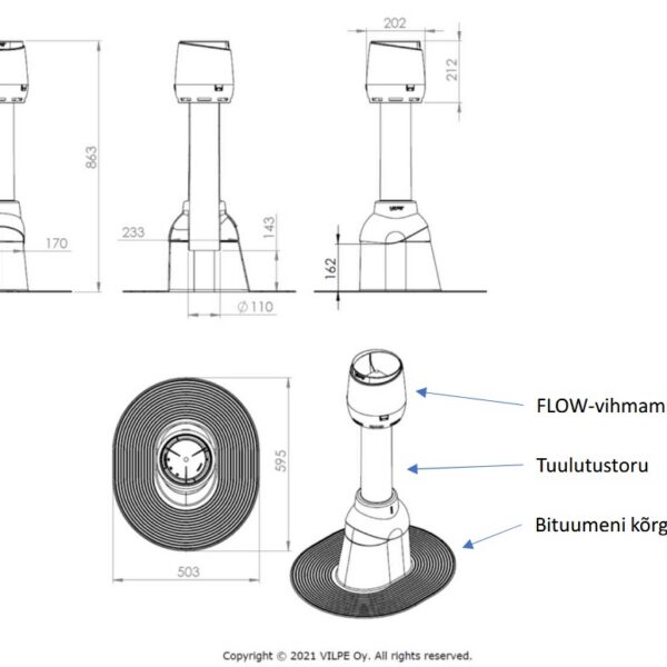Vilpe 110P/500 Flow on eristämätön viemärituuletussarja FLOW-sarjan sadesuojalla ja bitumiylipäästöllä tasaiselle katolle. Sitä käytetään bitumirullamateriaalista valmistetuille tasakatoille sekä viemärin tuuletusputkena että ullakon ja kattorakenteen tuuletukseen.