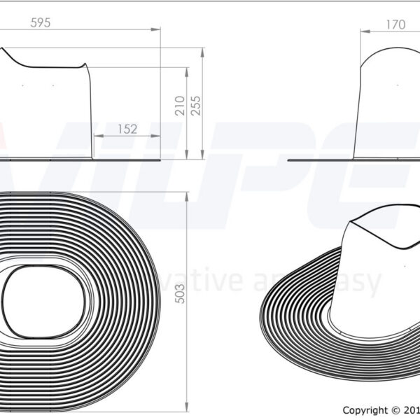 Mitat: Korkeus 150 mm. Aukko leikataan putken halkaisijan mukaan.