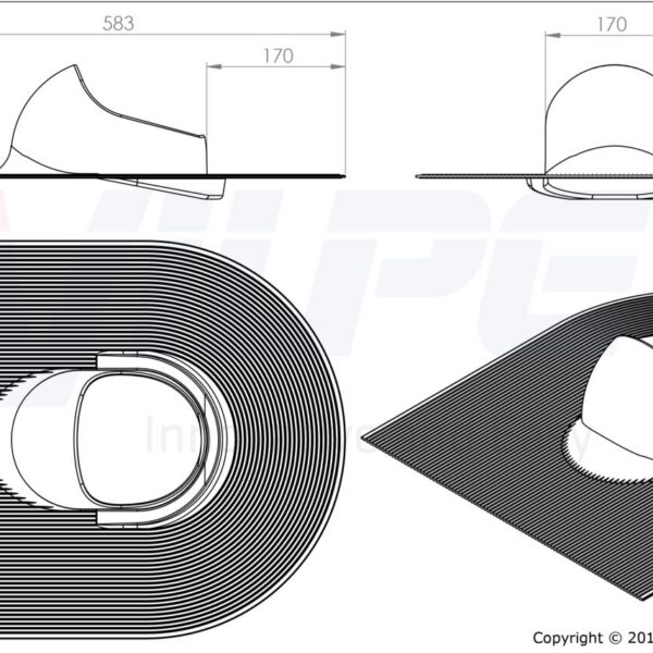 Käyttökohteet: Pyöreiden putkien läpiviennin tiivistämiseen huopakatteella. Valmistettu EPDM-kumista. Käyttölämpötila -30…+90°C. Laippa asennetaan kuumabitumin avulla kahden huopakerroksen väliin. Läpivientitiivisteet on tarkoitettu tasakatoille (<11,5° kaato).